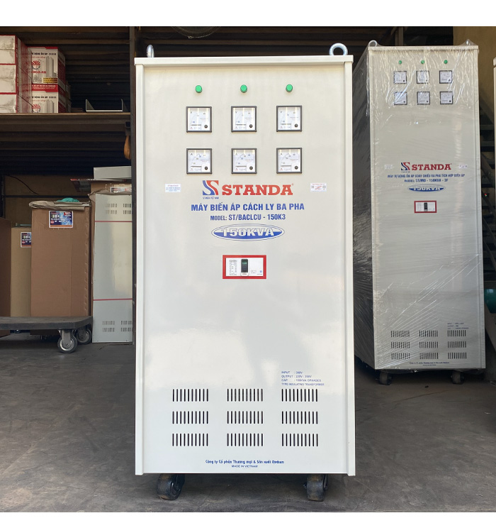 — Biến áp cách ly Standa 150kVA chính hãng Công ty Cổ phần Ổn áp Biến áp Standa Việt Nam điện ra 220v; 200v 3 pha: chuẩn đủ công suất chạy êm, ít tổn hao điện.