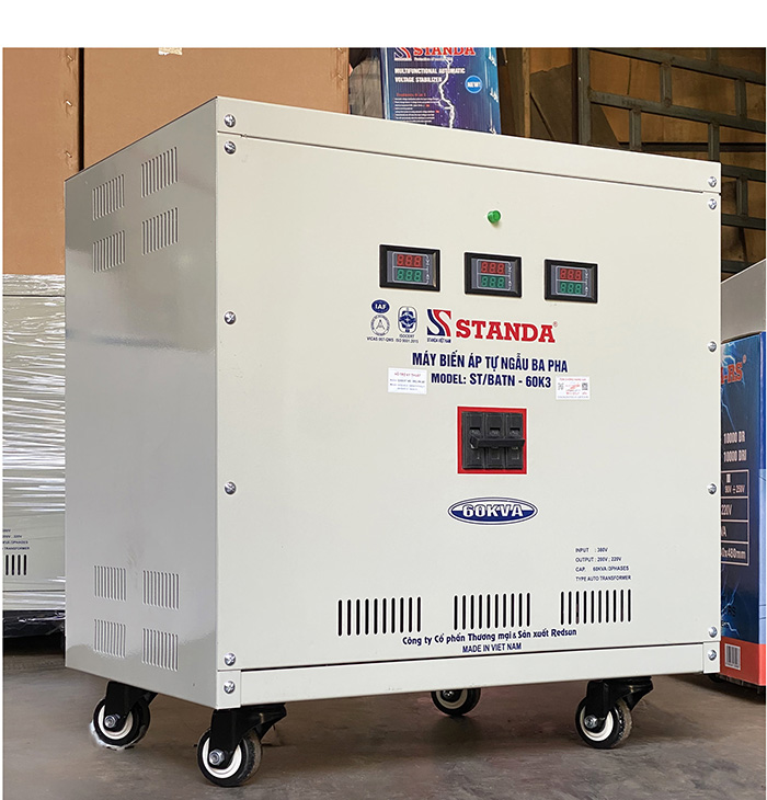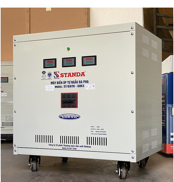 Biến áp standa 60kva 3 pha tư ngẫu dùng để biến đổi điện áp 3 pha 380v thành điện áp 200v – 220v 3 pha mà tần số vẫn không thay đổi để sử dụng cho các thiết bị nhập khẩu từ Nhật Bản, Mỹ , Đài Loại…và các nhu cầu đặc biệt khác